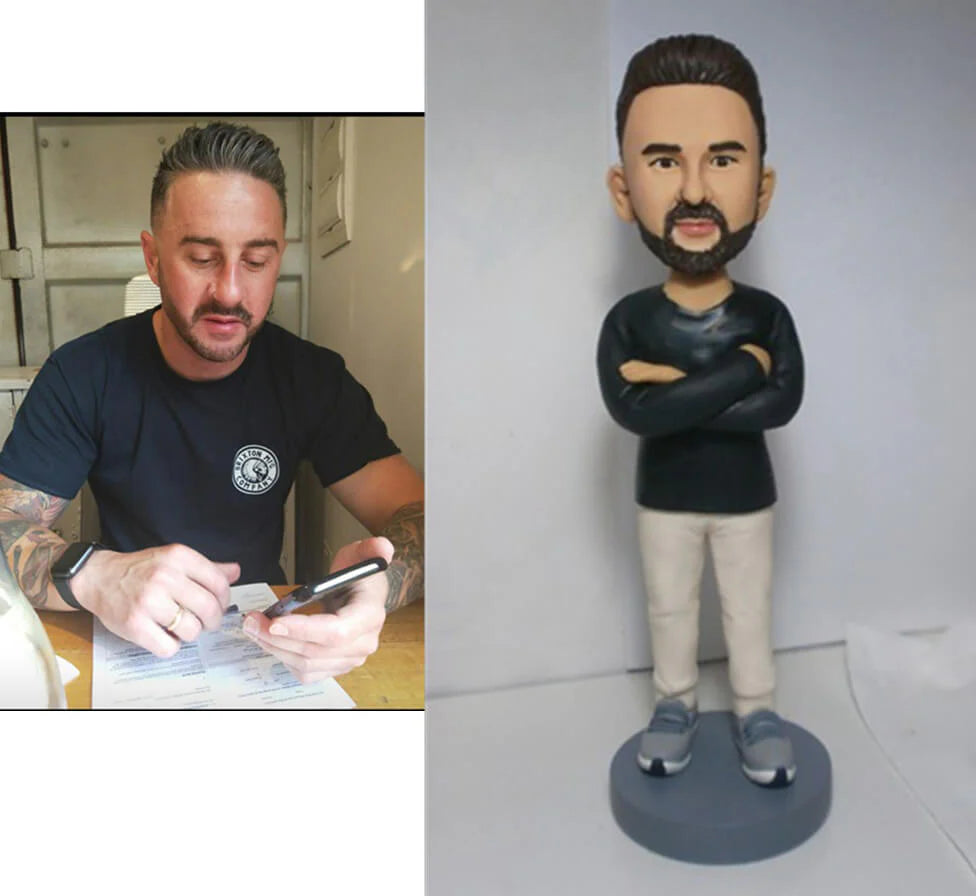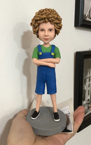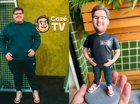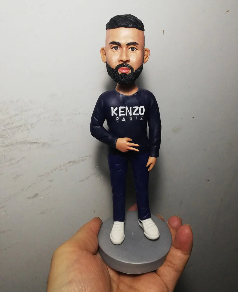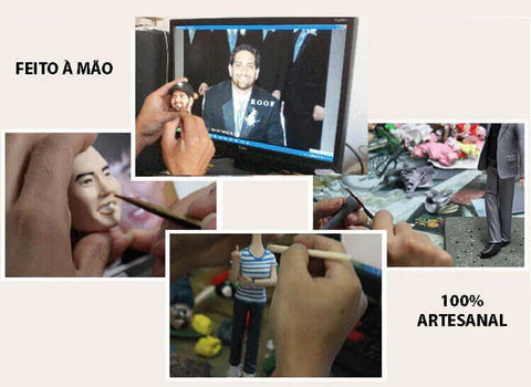 O boneco customizado é feito à mão, de forma artesanal, nos mínimos detalhes. É confeccionado em argila macia e pintado, depois vai para o forno em alta temperatura.